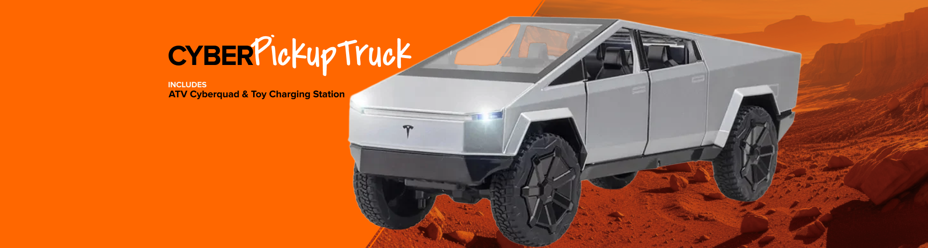 Introducing our new line of futuristic toy trucks. All come with toy charging stations and a mystery gift!