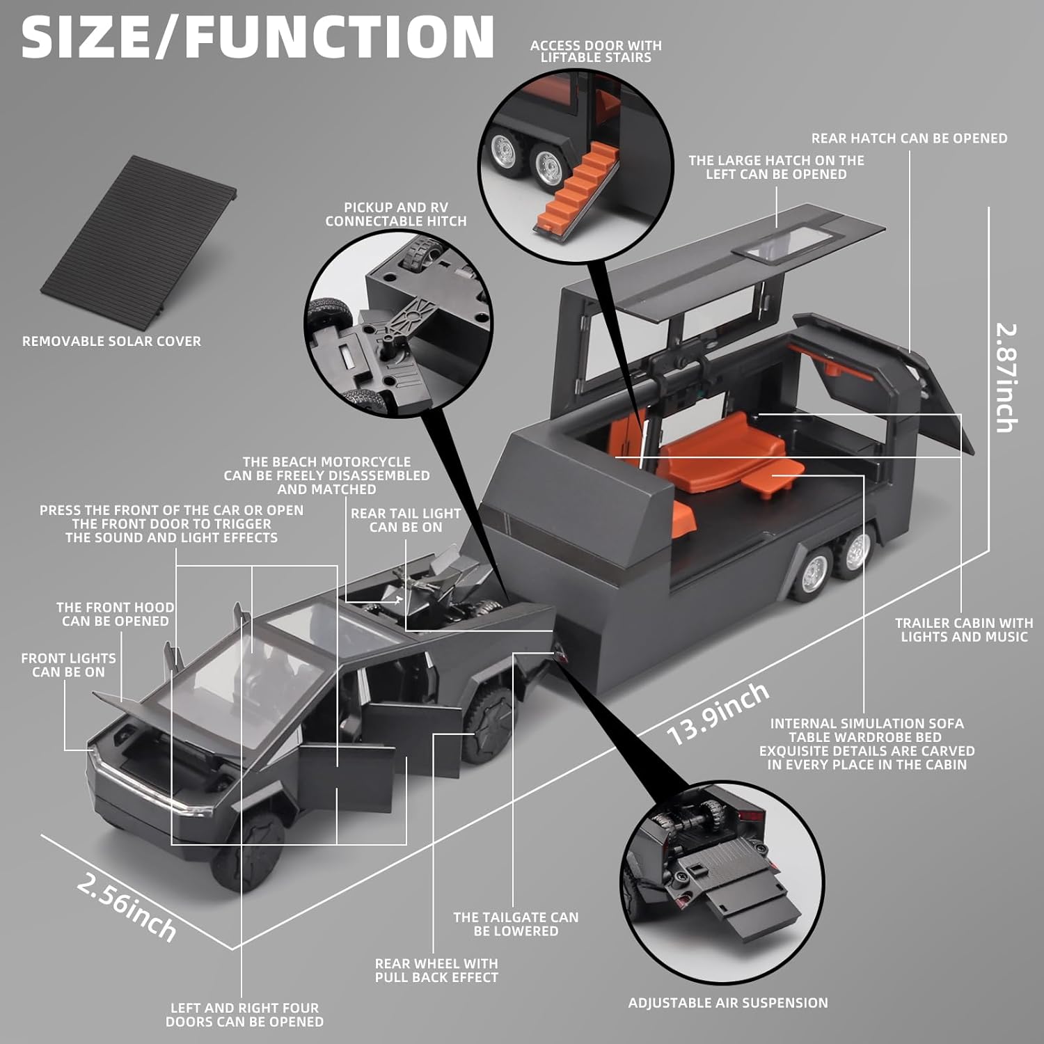 4-in-1 Ultimate Toy Truck with Trailer Camping Set: Includes a toy pick up truck, detachable camping trailer, ATV motorcycle & toy charging stand - doesn't really charge, just looks cool!